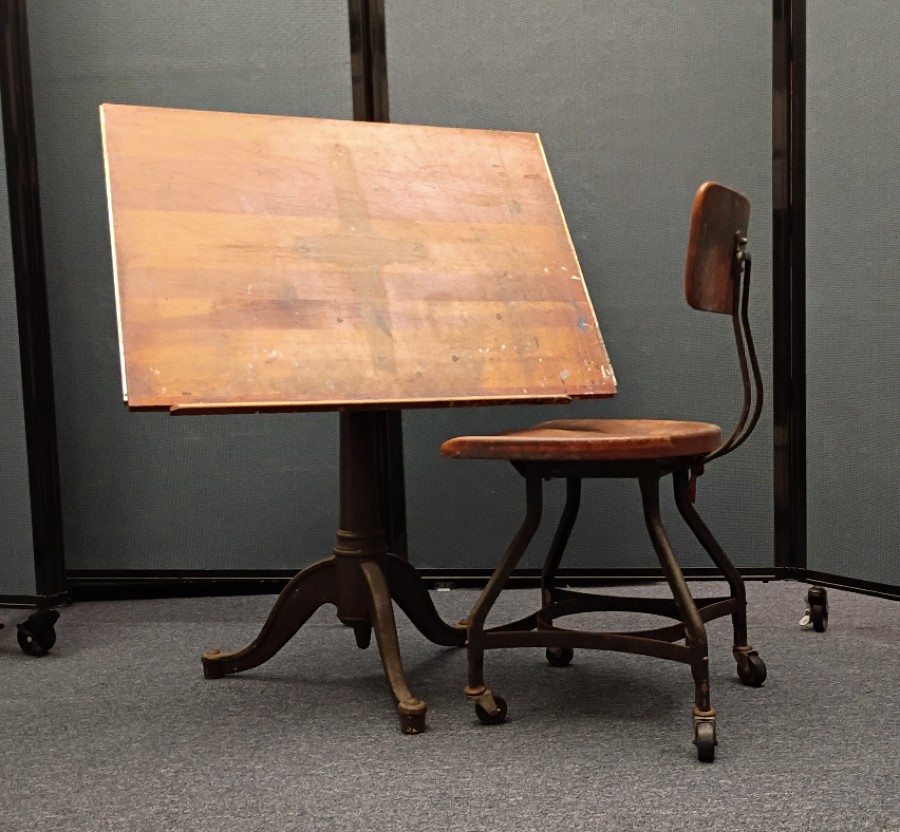With its heavy, cast iron base and its wooden surface marked from decades of use, this drawing table carries the weight of the years of use and the hundred of pages produced on it.”
