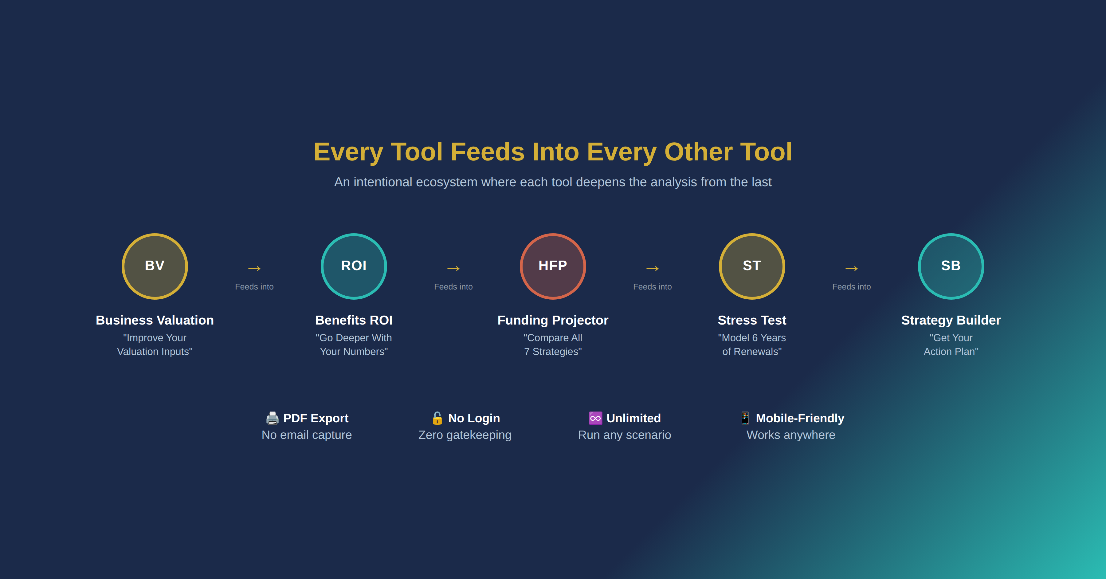 Every tool feeds into every other tool — an intentional ecosystem where each calculator deepens the analysis from the last, from Business Valuation through Strategy Builder.