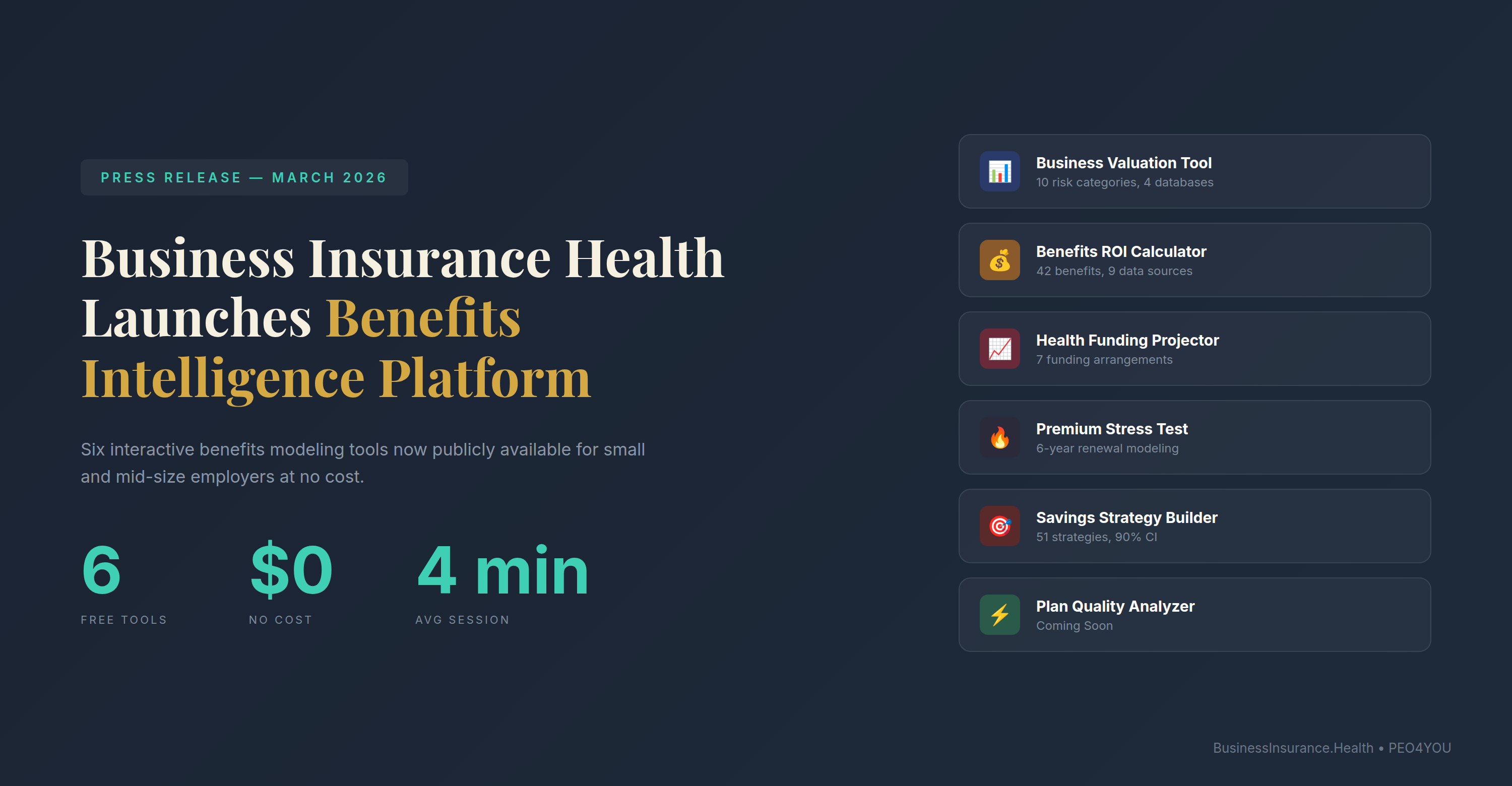 Business Insurance Health launches the Benefits Intelligence Platform — six free, actuarial-grade modeling tools for small and mid-size employers. No login, no email gate, no cost.