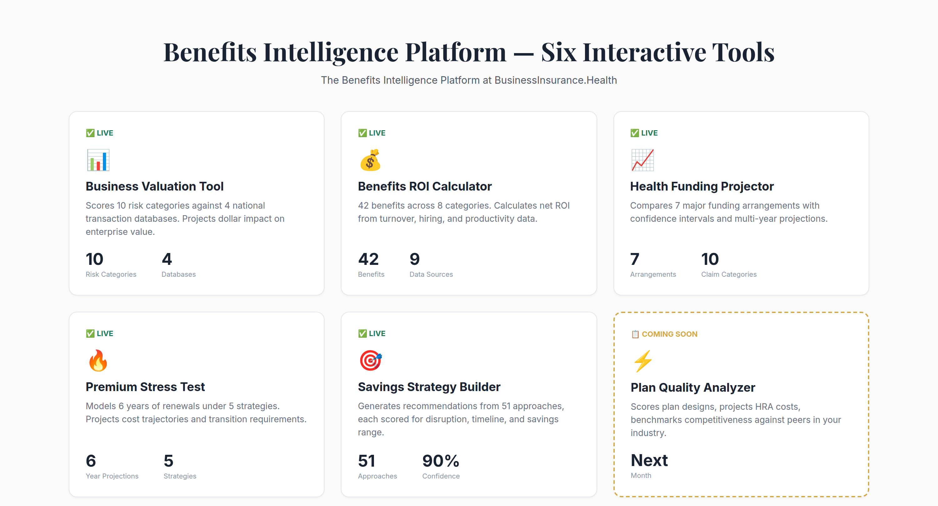 All six tools in the Benefits Intelligence Platform — five live, one coming soon — each free with no login or email gate required.